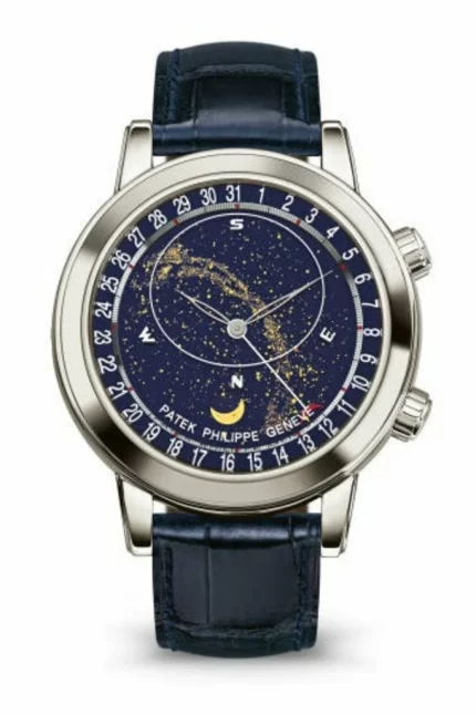 Dial : Black sapphire-crystal disks for sky background and moon phases. Transparent sapphire-crystal disk for sky chart and Milky Way.